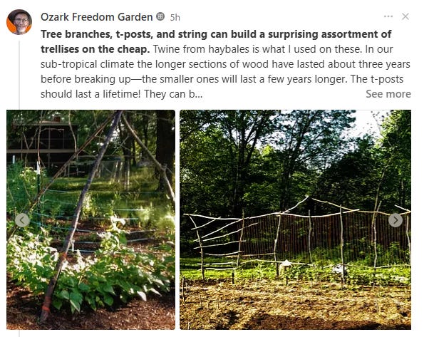 Excess woody growth can also be put to good use. If you or someone you know needs to cut back some brush or do some pruning, you might be able to create some really attractive and unique supports for your plants. Check out this note from Ozark Freedom Garden for inspiration. You might want to click through to read the whole note and scroll through all the photos. You’ll find some really creative ideas. :)